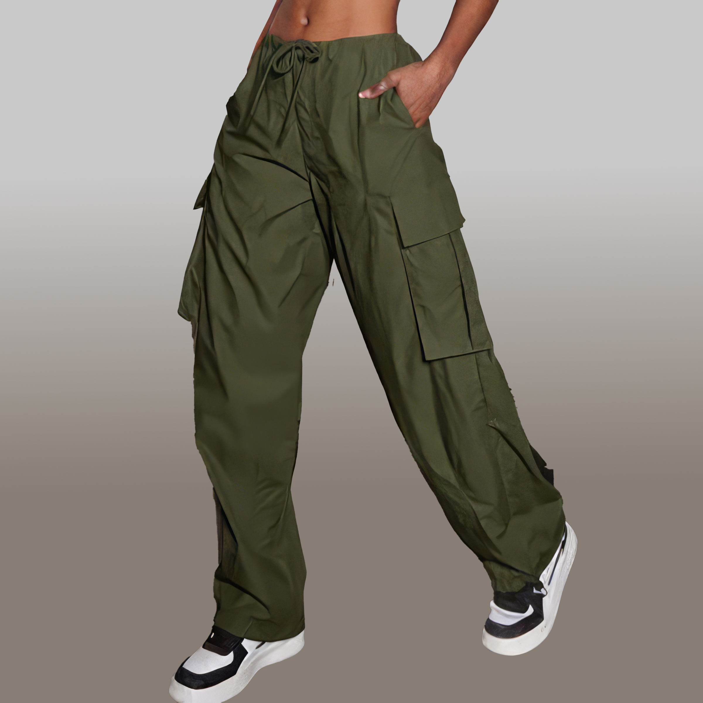 Functional cargo pockets with tape flap, adding a stylish touch while providing storage space. Solid color with simple design,